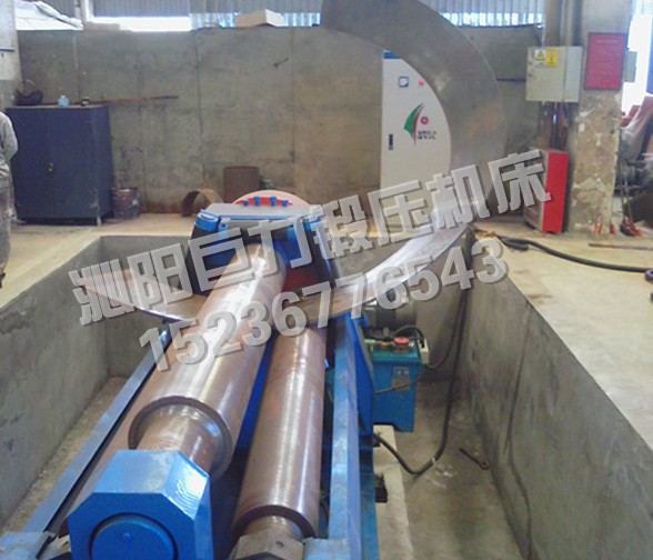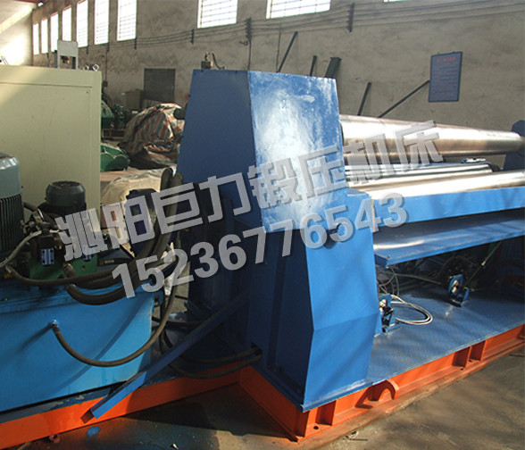 該機(jī)型的上輥固定,兩下輥呈傾斜狀做旋轉(zhuǎn)運(yùn)動(dòng),兩下輥可以同時(shí)升降,也可以單升單降,用以完成板材的端部預(yù)彎。