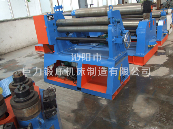 三輥非對稱式卷板機結(jié)構(gòu)形式為三輥非對稱式,上輥為主傳動輥,在兩下輥中央對稱位置作垂直升降運動,通過液壓缸內(nèi)的液壓油作用子活塞而獲得,為液壓傳動;兩下輥體旋轉(zhuǎn)運動,通過減速機的輸出齒輪與下輥齒輪齒合,為卷制板材提供扭力,同時作為主傳動;邊輥作傾斜升降運動,具有預(yù)彎和卷圓雙重功能,結(jié)構(gòu)緊湊,操作維修方便。