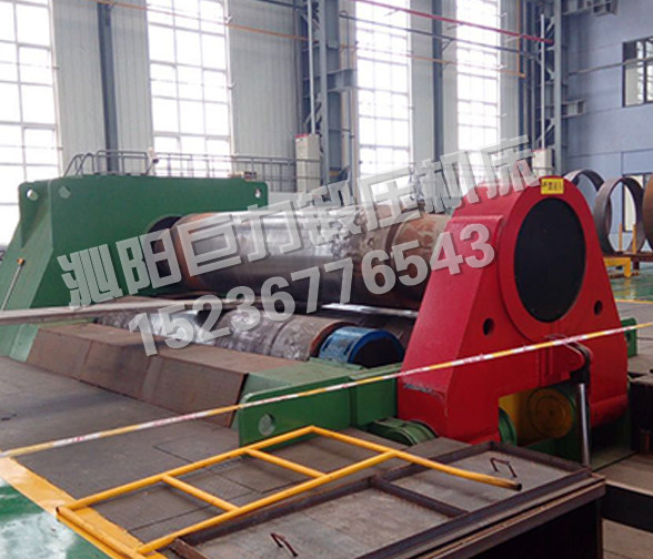 該四輥卷板機(jī)與對(duì)稱(chēng)三輥卷板機(jī)比較,它可以不借助其它設(shè)備模具,直接予彎板材端部,而且剩余直邊較小;它可以不使板材調(diào)頭,而卷成工件。